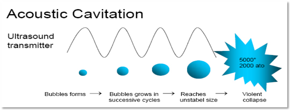 The imploding of the gas bubbles creates very high pressure waves, up to 2000 atmospheres, that rupture the membranes of the micro-organisms.